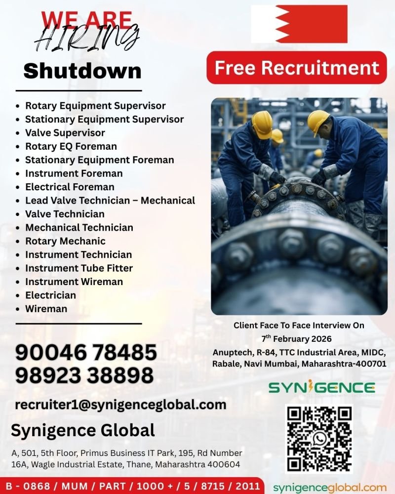 Bahrain Shutdown Jobs 2026: Free Recruitment for Oil & Gas Shutdown Project Urgent hiring alert for skilled technicians and supervisors in oil & gas shutdown projects in Bahrain! Synigince Global (Govt. Approved Recruitment Agency – License No. B-08688/MUM/PART/1000+/5/8715/2011), a trusted Thane-based overseas consultancy, is conducting client face-to-face interviews on 7th February 2026 for a leading