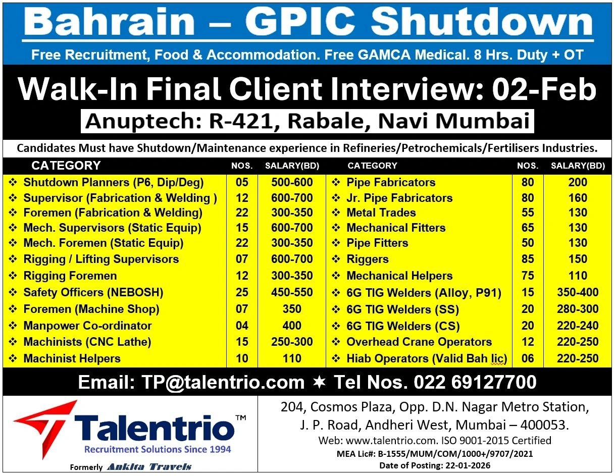 Bahrain Shutdown Jobs 2026: Urgent Vacancies for GPIC Shutdown Project Free recruitment opportunity for skilled professionals in Bahrain shutdown/maintenance projects at GPIC (Gulf Petrochemical Industries Company)! Talentrio Recruitment Solutions (Govt. Approved – MEA License No. B-1555/MUM/COM/1000+/9707/2021, ISO 9001:2015 Certified), a Mumbai-based agency since 1994, is conducting walk-in final client interviews on 2 February 2026 for