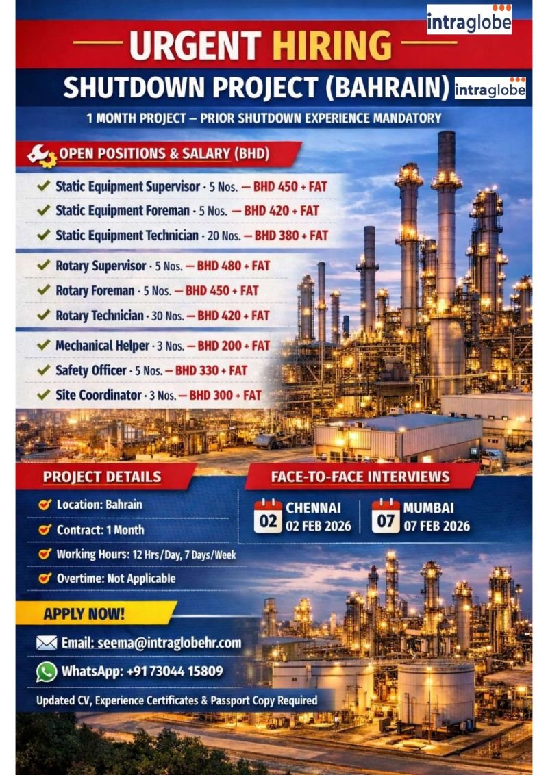 Urgent Hiring for Shutdown Project in Bahrain 2026 – Apply Now