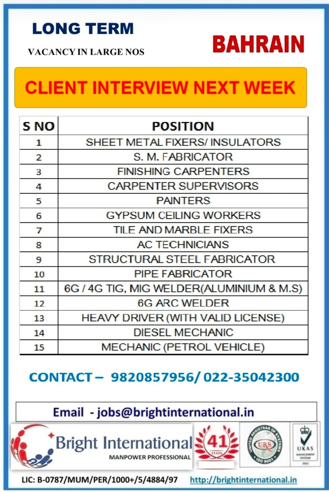 Bahrain Long Term Jobs 2026 | Client Interview Next Week | Large Vacancies Bahrain Jobs for Skilled Workers – Immediate Hiring for Multiple Positions Bright International Manpower Professional is urgently hiring skilled and semi-skilled workers for long-term projects in Bahrain. There are large numbers of vacancies, and client interviews are scheduled for next week, making