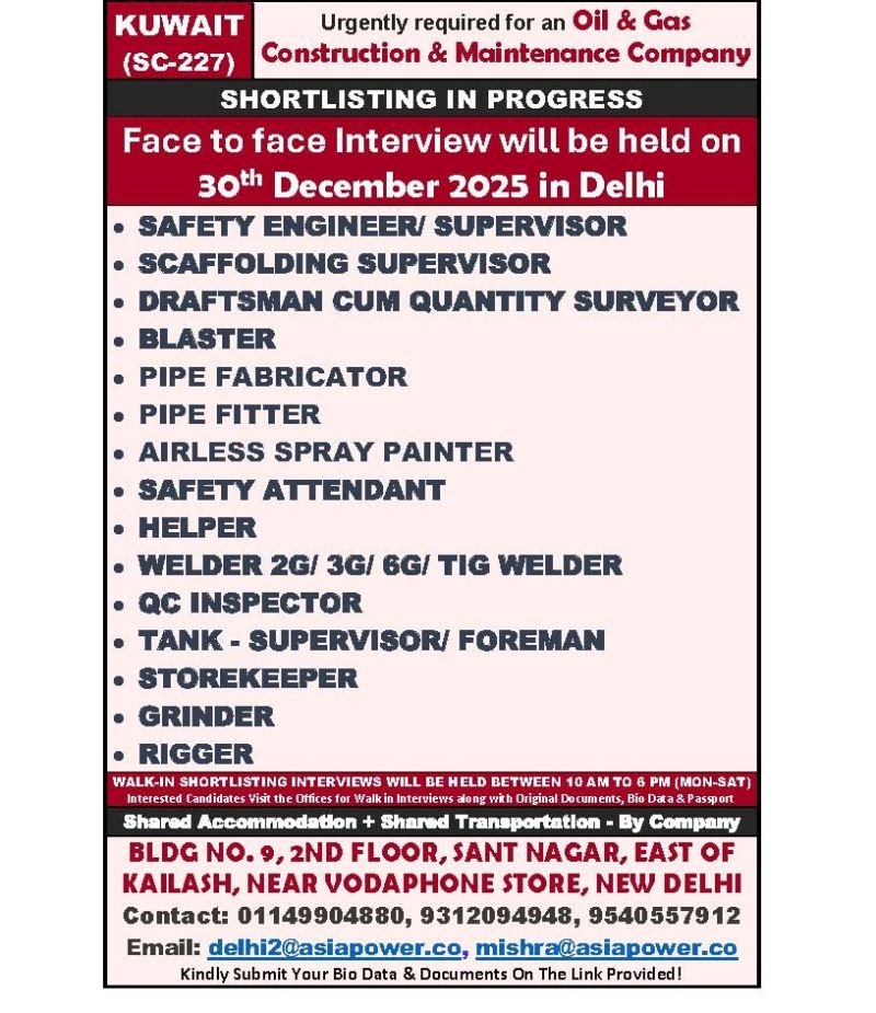 Latest Oil & Gas, Manufacturing and Construction Jobs in Kuwait 2025 – Multiple Positions (Free Recruitment)