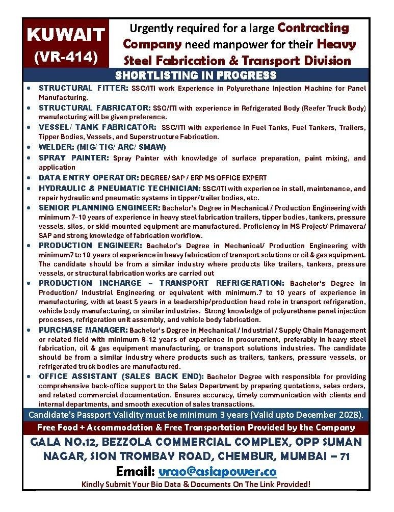 Jobs in Kuwait : Hiring For Heavy Steel Fabrication & Transport Company
