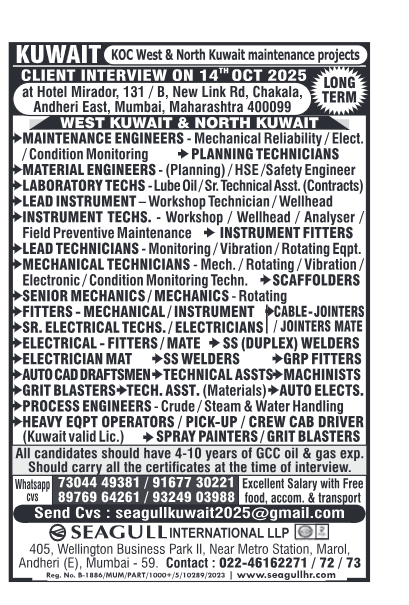 Are you seeking long-term career opportunities in Kuwait? Seagull International LLP, a leading recruitment agency, is organizing a client interview for KOC West & North Kuwait maintenance projects on Tuesday, October 14, 2025, at 1:00 PM IST at Hotel Mirador, 13/1, B. New Link Rd, Chakala, Andheri East, Mumbai, Maharashtra 400099. Positions available include Maintenance Engineers, QA/QC Engineers, Instrument Technicians, and more, with excellent salaries and benefits including free food, accommodation, and transport.