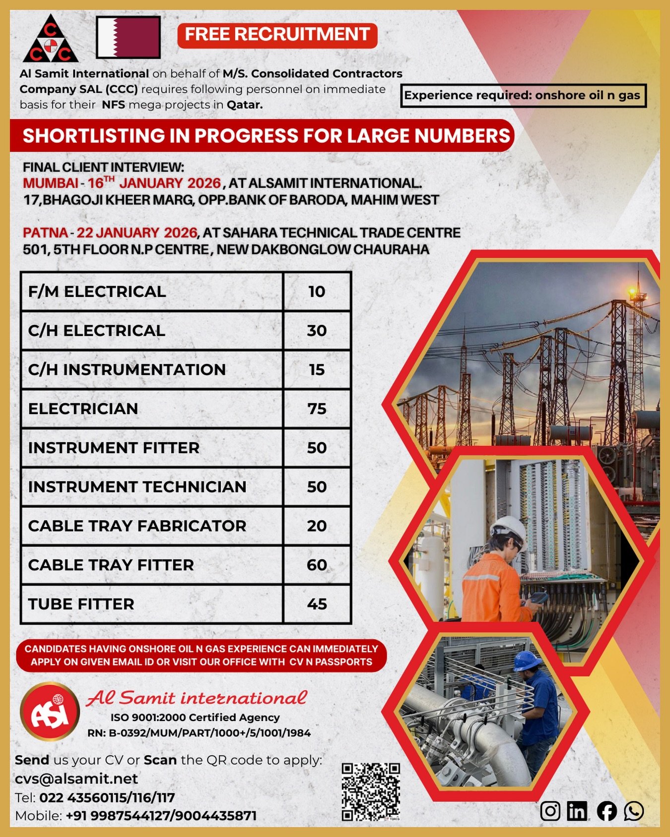 Consolidated Contractors Company SAL (CCC) is urgently recruiting experienced personnel for their NFS Mega Onshore Oil & Gas Projects in Qatar. Recruitment by Al Samit International (ISO 9001:2000 Certified Agency).