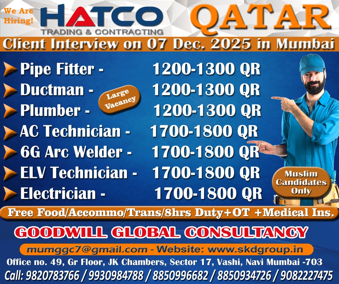 Client: HATCO Trading & Contracting – Leading MEP & Infrastructure Company in Qatar Project: Long-Term Building & Infrastructure Projects Interview Date: 07 December 2025 (Sunday) – Mumbai