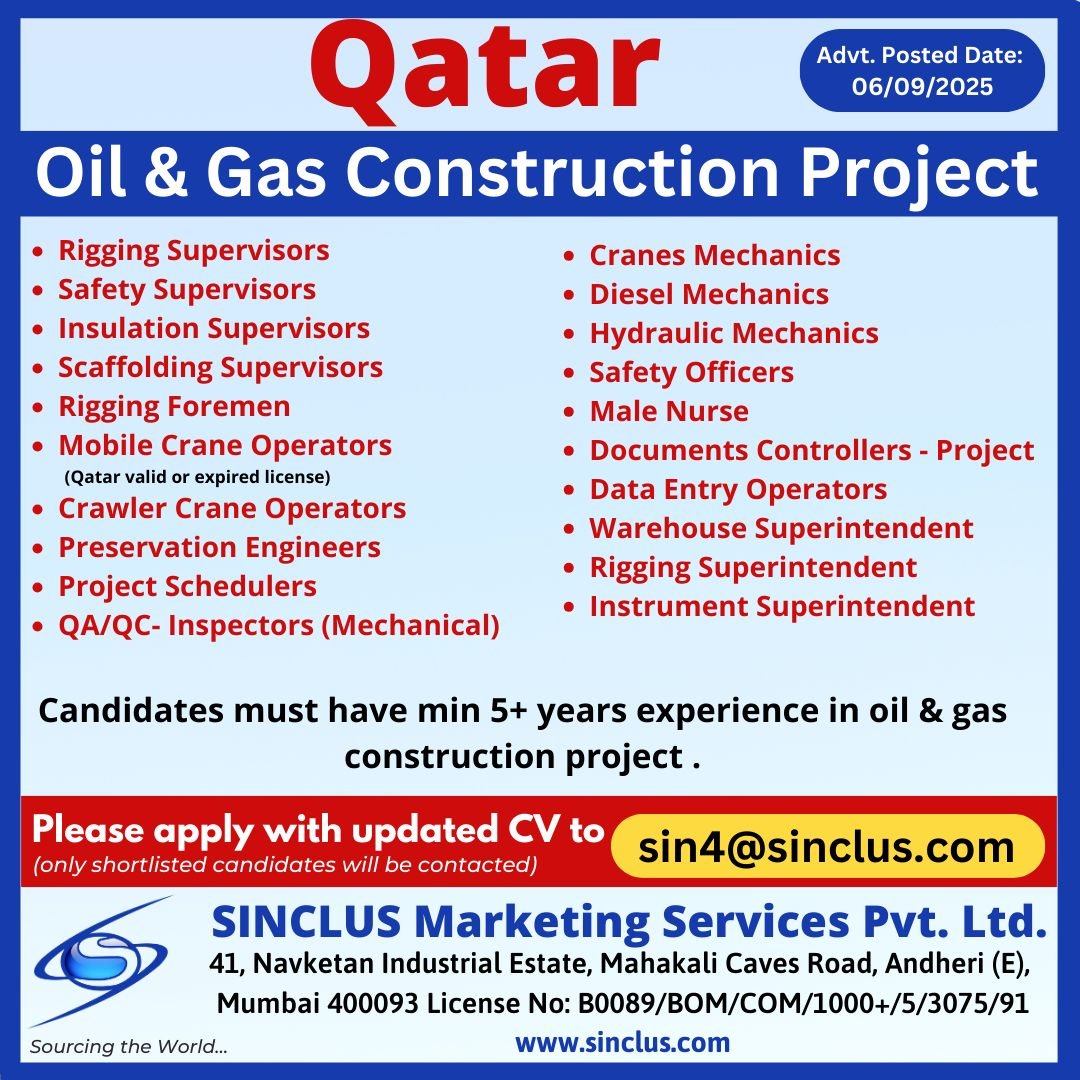 Sinclus Marketing Services Pvt. Ltd. is recruiting for an Oil & Gas Construction Project in Qatar. With vacancies for experienced professionals, this opportunity is ideal for those with a Qatar valid or expired license. Apply now!