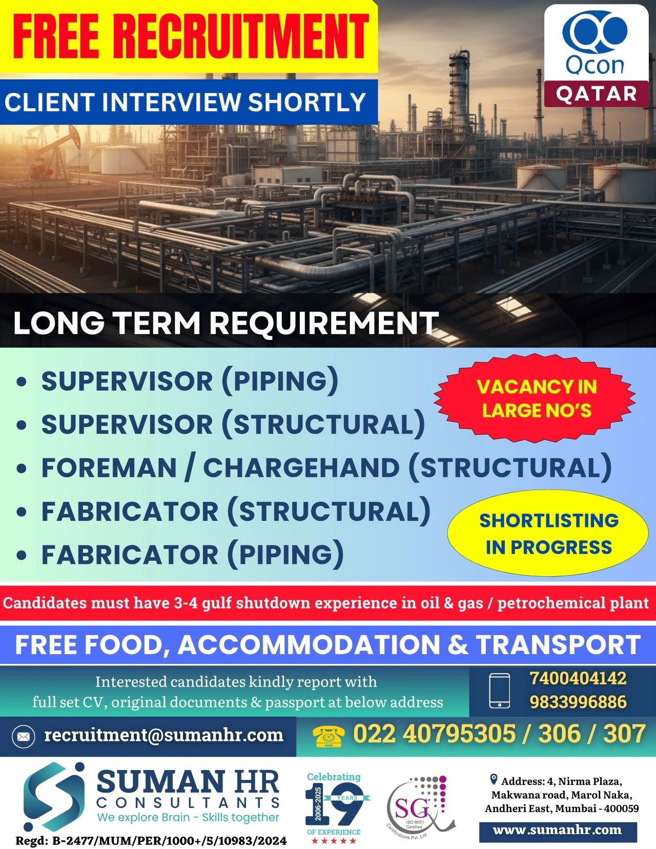 Client: Qatar Engineering & Construction Company (Qcon) – One of Qatar’s biggest EPC & Shutdown contractors Project: Oil & Gas / Petrochemical Plant – Long Term + Shutdown Vacancies in VERY LARGE numbers