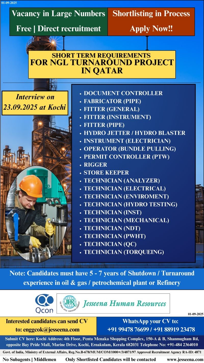 Jobs In Qatar – Short Term Requirements For Ngl Turnaround Project