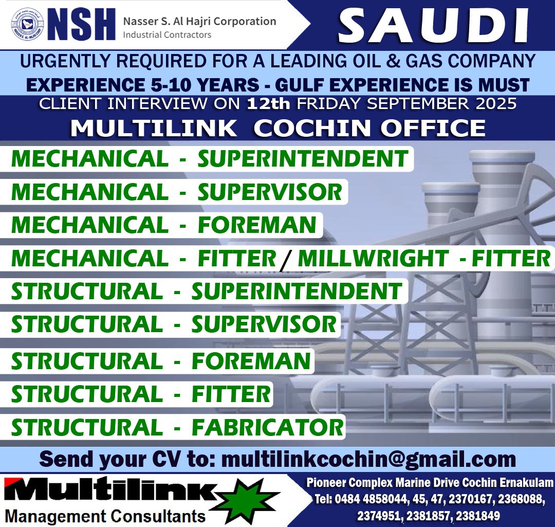 Join a prestigious oil and gas company in Saudi Arabia with urgent openings! A client interview is scheduled for 12th Friday September 2025 at the Multilink Cochin office. Apply now if you have 5-10 years of experience, with Gulf experience being a must.