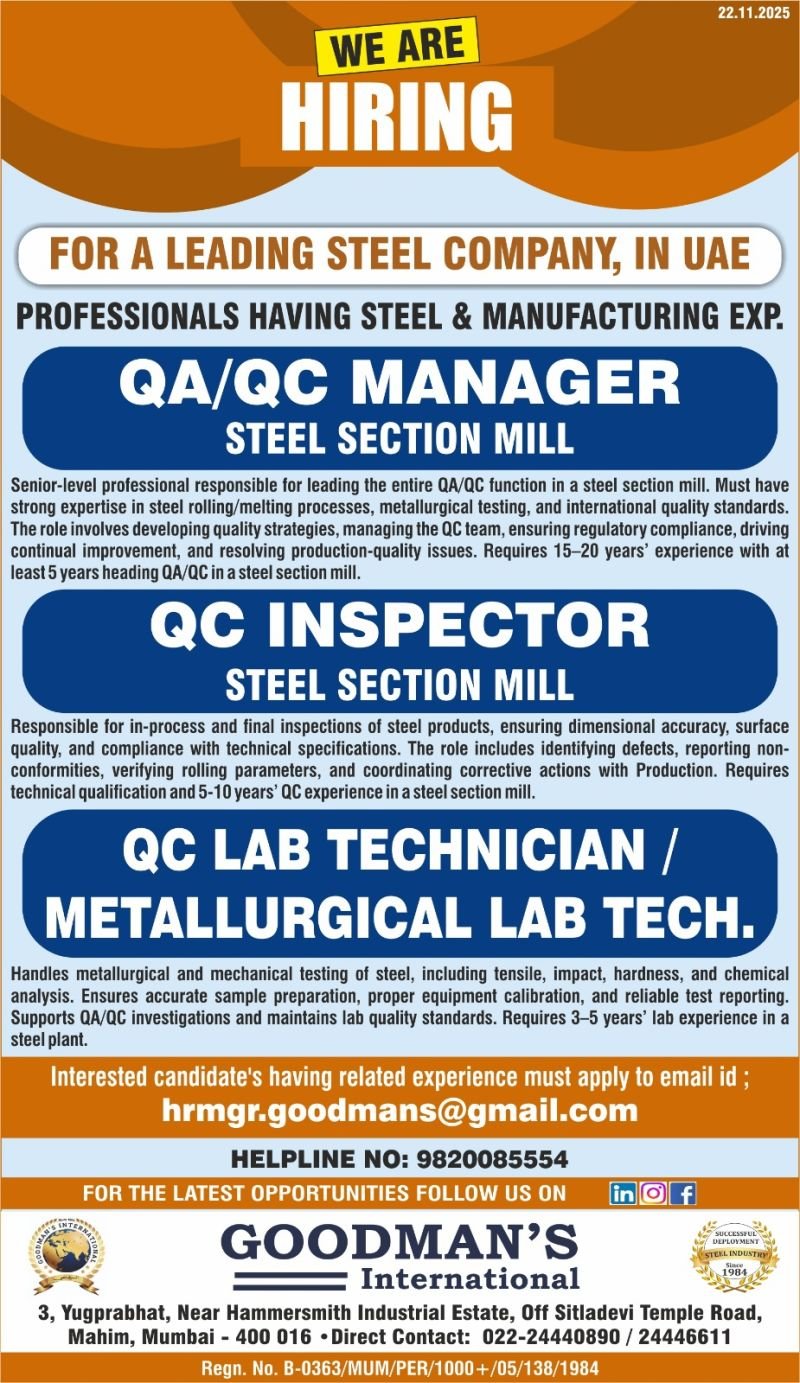 - Experience Required: 15–20 years (minimum 5 years as QA/QC Head in steel section mill)