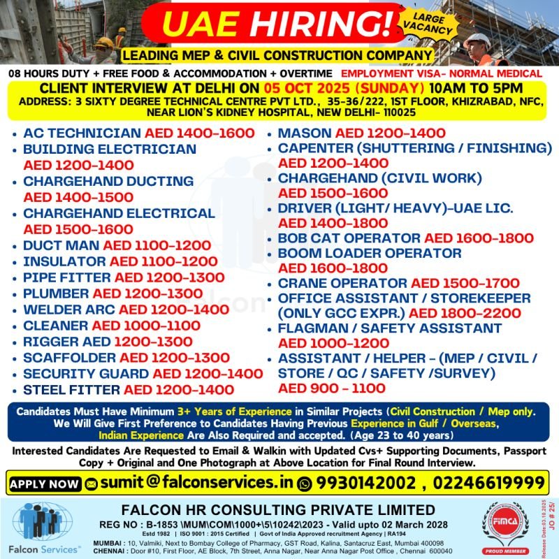 Are you seeking a rewarding career with a leading MEP & Civil Construction company in the UAE? Falcon HR Consulting is thrilled to announce a massive hiring drive with a wide range of vacancies. Enjoy 08 hours duty, free food, accommodation, overtime, and an employment visa with normal medical requirements.