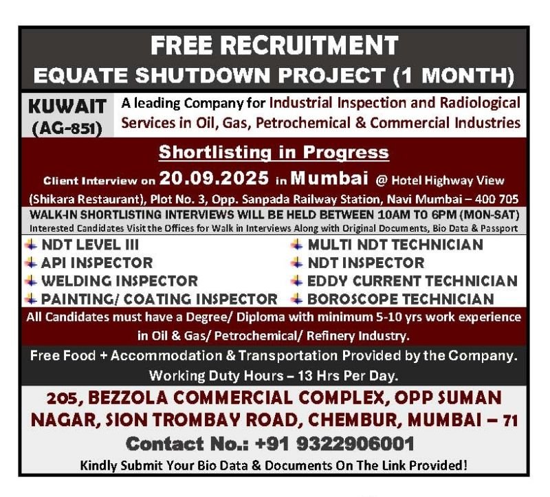Kuwait – Free Recruitment For Equate Shutdown Project