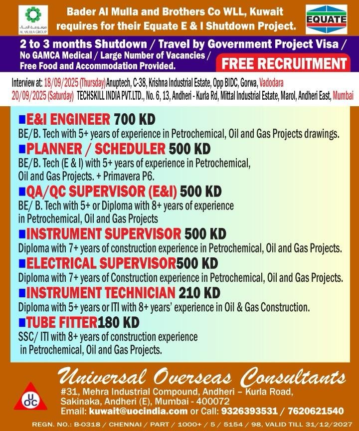 Kuwait – Hiring For Bader Al Mulla & Equate Shutdown Project