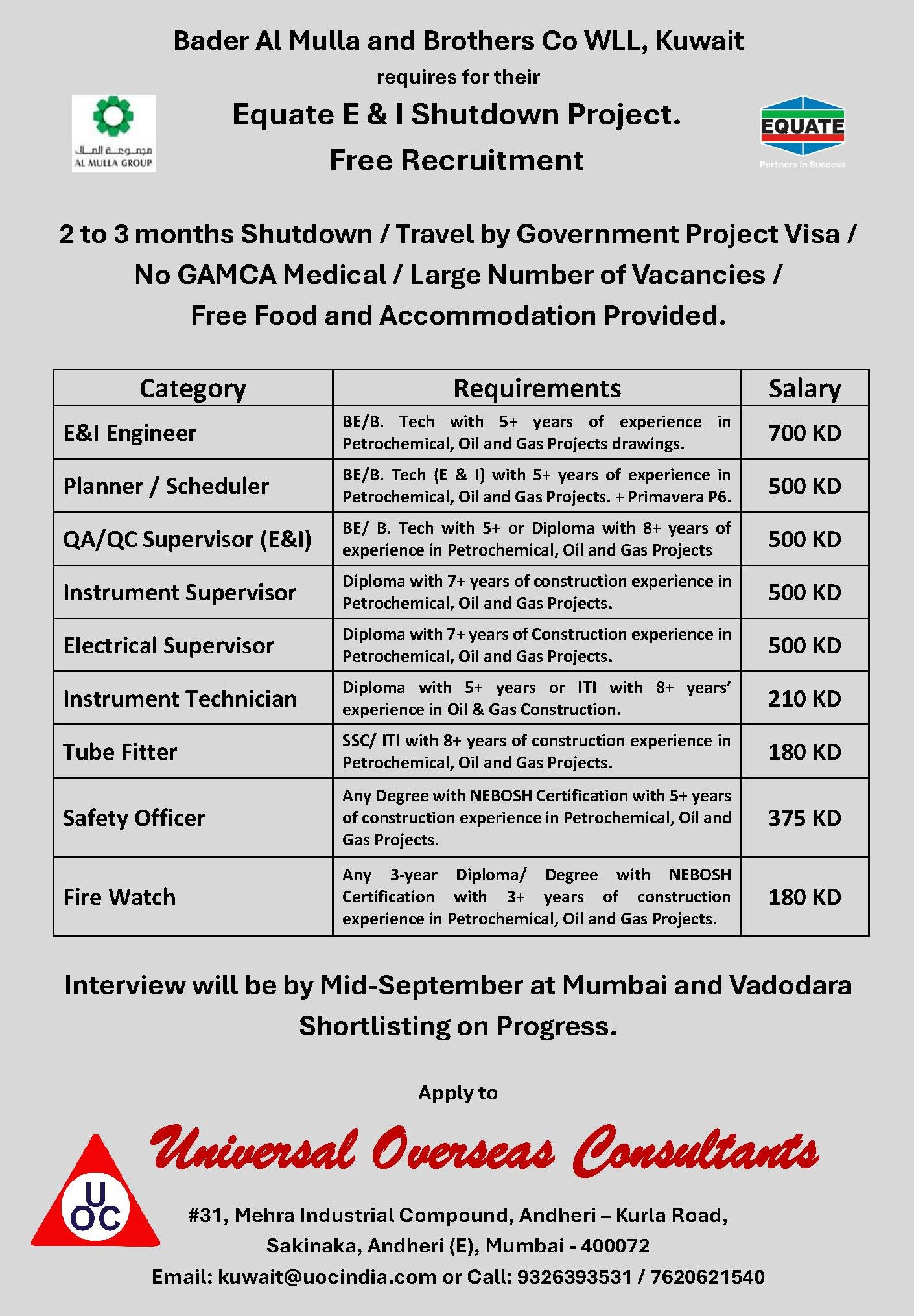 Bader Al Mulla and Brothers Co WLL, in partnership with Equate, is offering free recruitment for their E&I Shutdown Project. This is a 2 to 3 months shutdown project with travel by Government Project Visa, no GAMCA medical required, and a large number of vacancies. Free food and accommodation are provided.