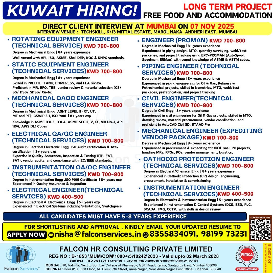 Direct Client Interview in Mumbai on 07 Nov 2025! Free Food & Accommodation | Min. 5–8 yrs Gulf exp | All roles KWD 400–800.