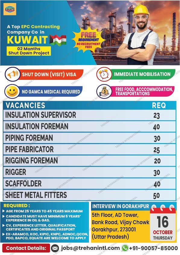 Join a top EPC contracting company in Kuwait for an exciting 02-month Shutdown Project. Free recruitment with no fees—apply now!