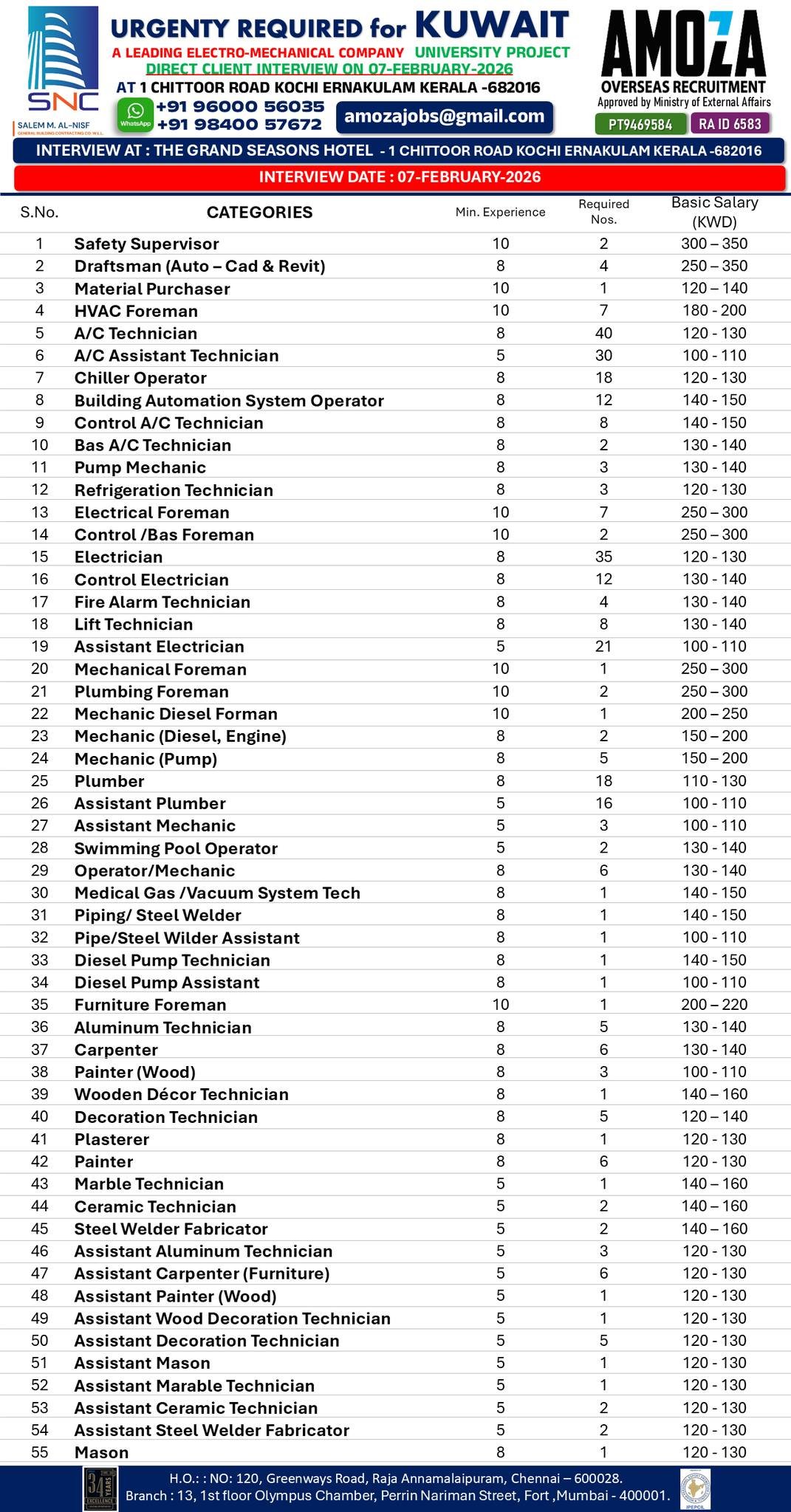A leading electro-mechanical company is urgently hiring skilled and experienced professionals for a Kuwait University Project. The recruitment is being conducted through a direct client interview in Kochi, Kerala, by AmOza Overseas Recruitment, a government-approved overseas manpower consultancy.