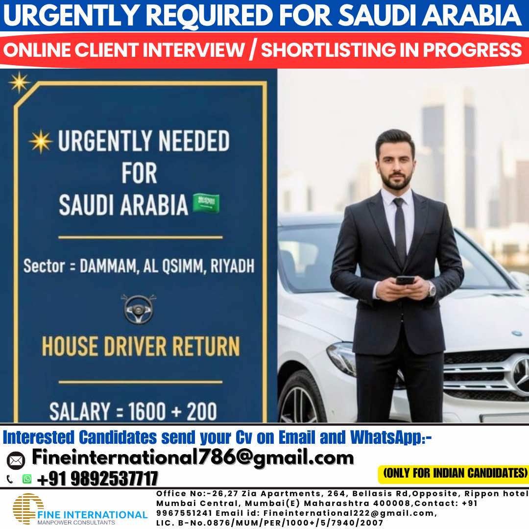 Saudi Arabia House Driver Jobs: Dammam, Al Qassim, Riyadh | SAR 1600 + 200 | Online Interviews