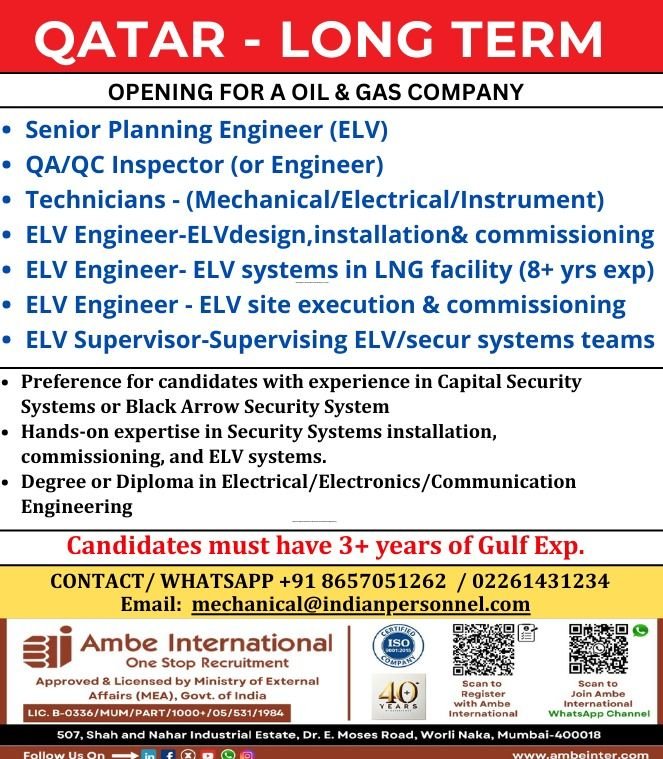 Explore exciting career opportunities in Qatar with a leading oil & gas company. We are hiring for multiple roles including Senior Planning Engineer (ELV), QA/QC Inspector, Technicians, and more. Apply now for a chance to work in a dynamic environment!
