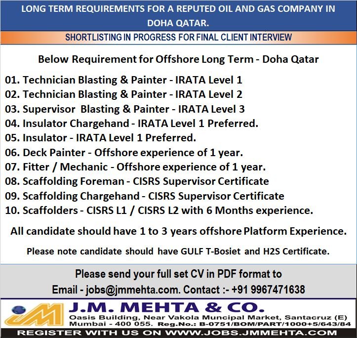 J.M. Mehta & Co. is hiring for a reputed oil and gas company in Doha, Qatar. Shortlisting is in progress for final client interviews. Apply now for offshore long-term positions with 1-3 years of experience required!