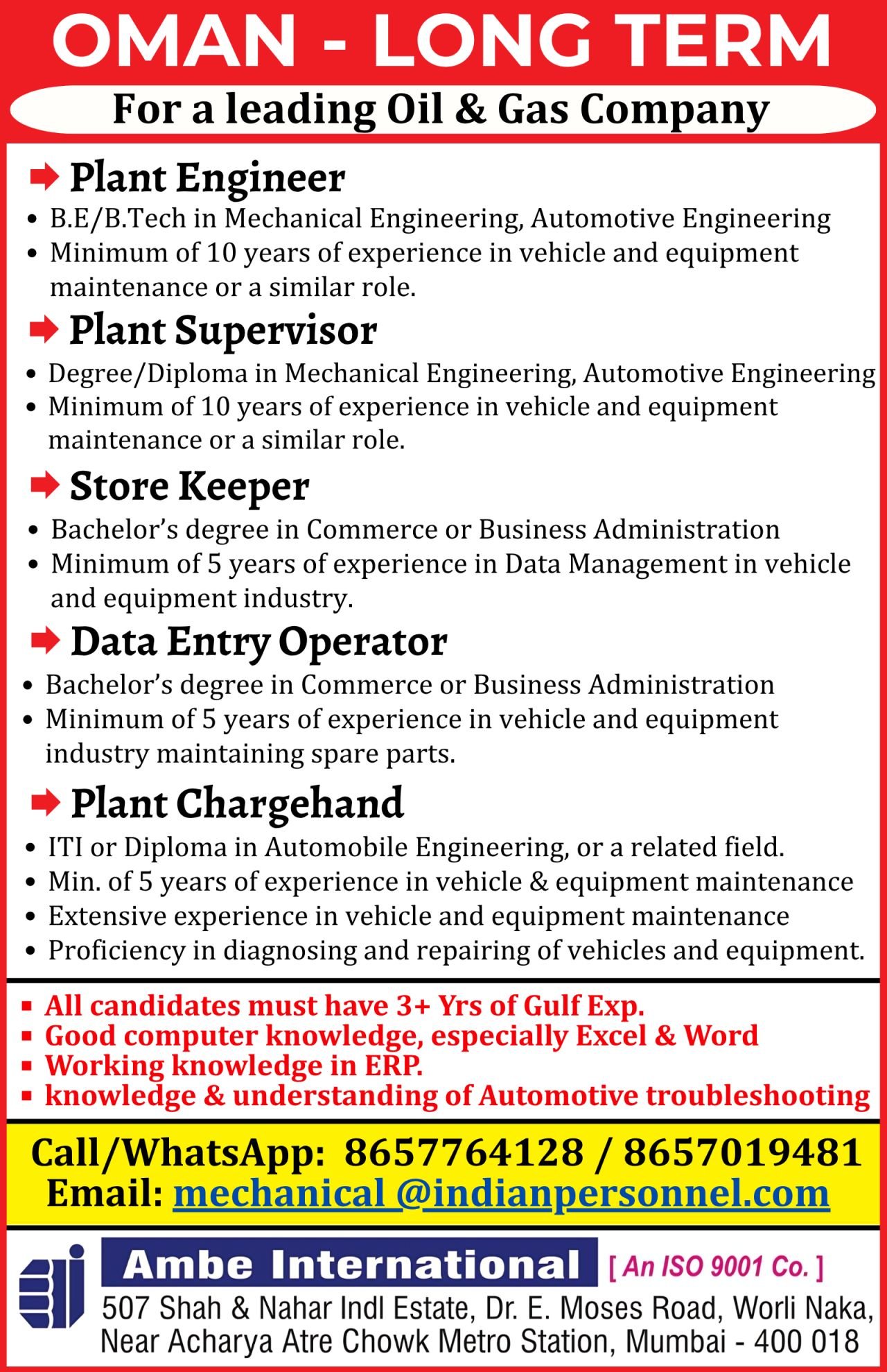 Urgent Requirement! Ambe International (An ISO 9001 Co.) is hiring experienced professionals for a leading Oil & Gas Company in Oman – Long Term Project. Minimum 3+ years Gulf experience compulsory for all positions.