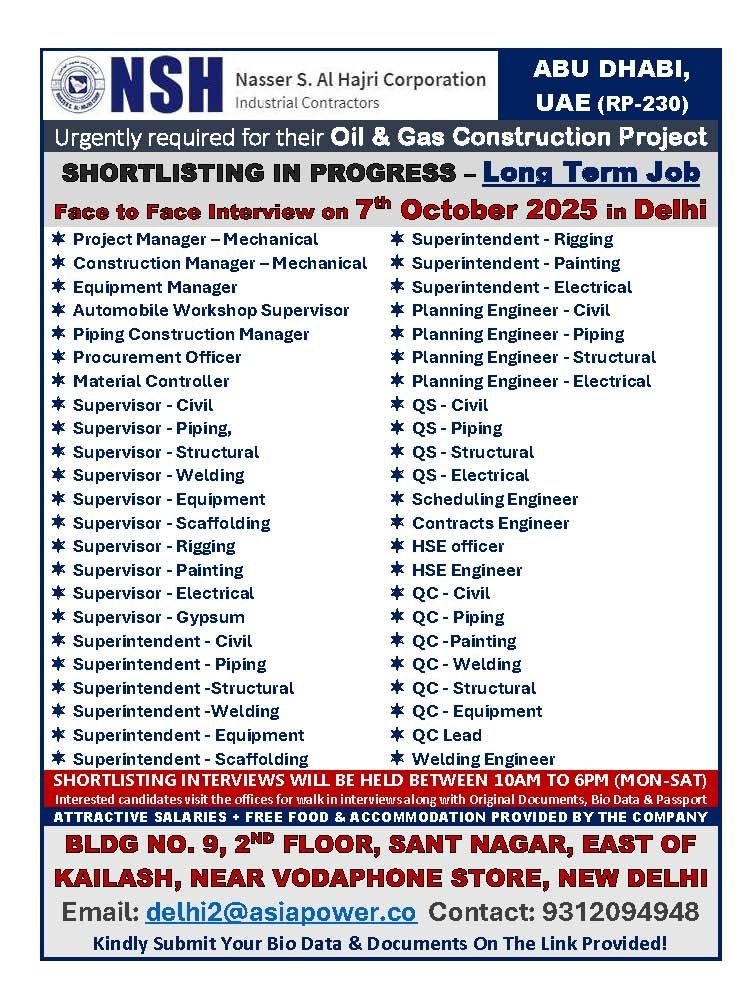 Manager/ Officer/ Supervisor/ Superintendent/ Planning Engineer/