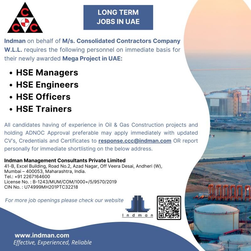 Are you an experienced professional seeking long-term career opportunities in the UAE? Indman, on behalf of M/s. Consolidated Contractors Company W.L.L., is hiring for their newly awarded Mega Project. Apply now for immediate openings!