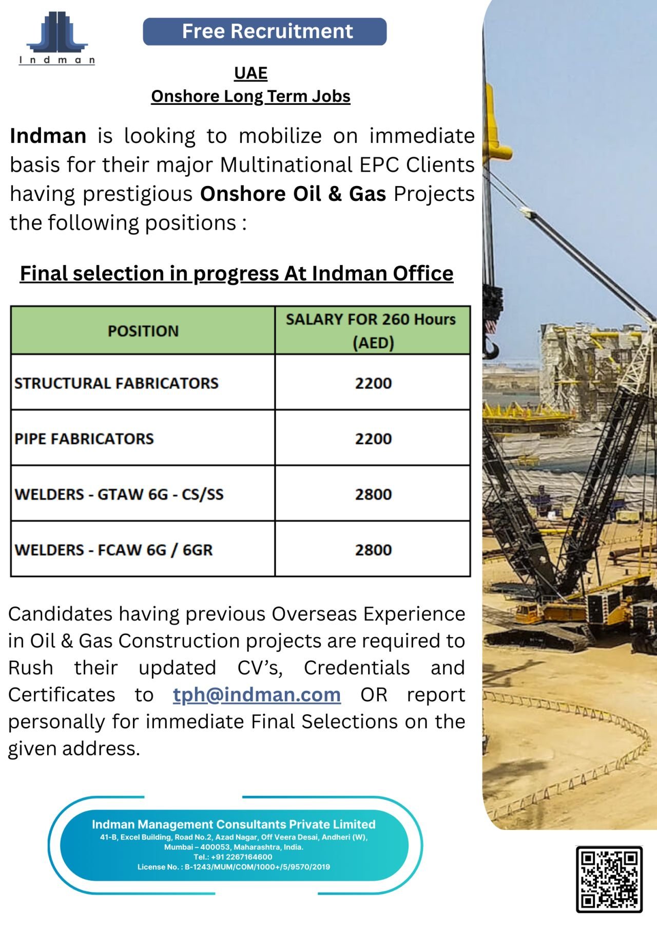 This is a free recruitment opportunity with final selections in progress at the Indman office in Mumbai. Candidates with proven Gulf or overseas experience in Oil & Gas are preferred for immediate deployment.