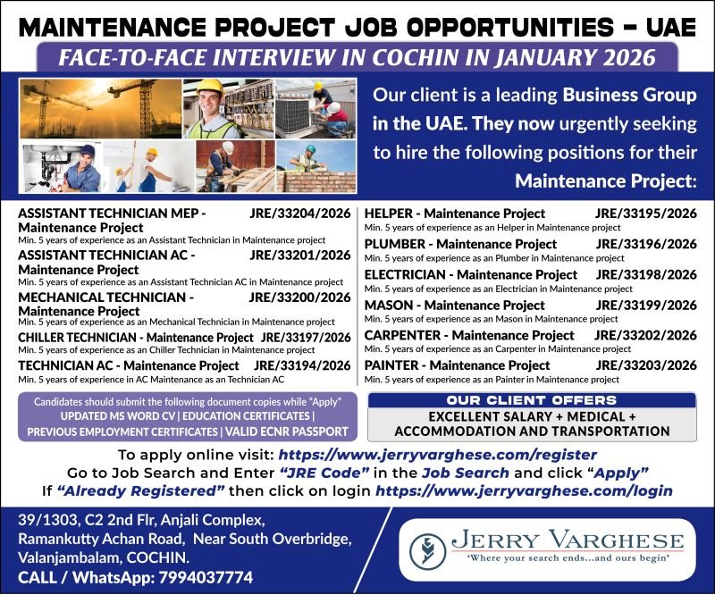 Are you an experienced maintenance technician in MEP, AC, plumbing, electrical, masonry, carpentry, or painting? A leading Business Group in the UAE is urgently hiring skilled professionals for their ongoing Maintenance Project. This is a direct face-to-face interview opportunity in Cochin with excellent salaries, medical coverage, accommodation, and transportation.