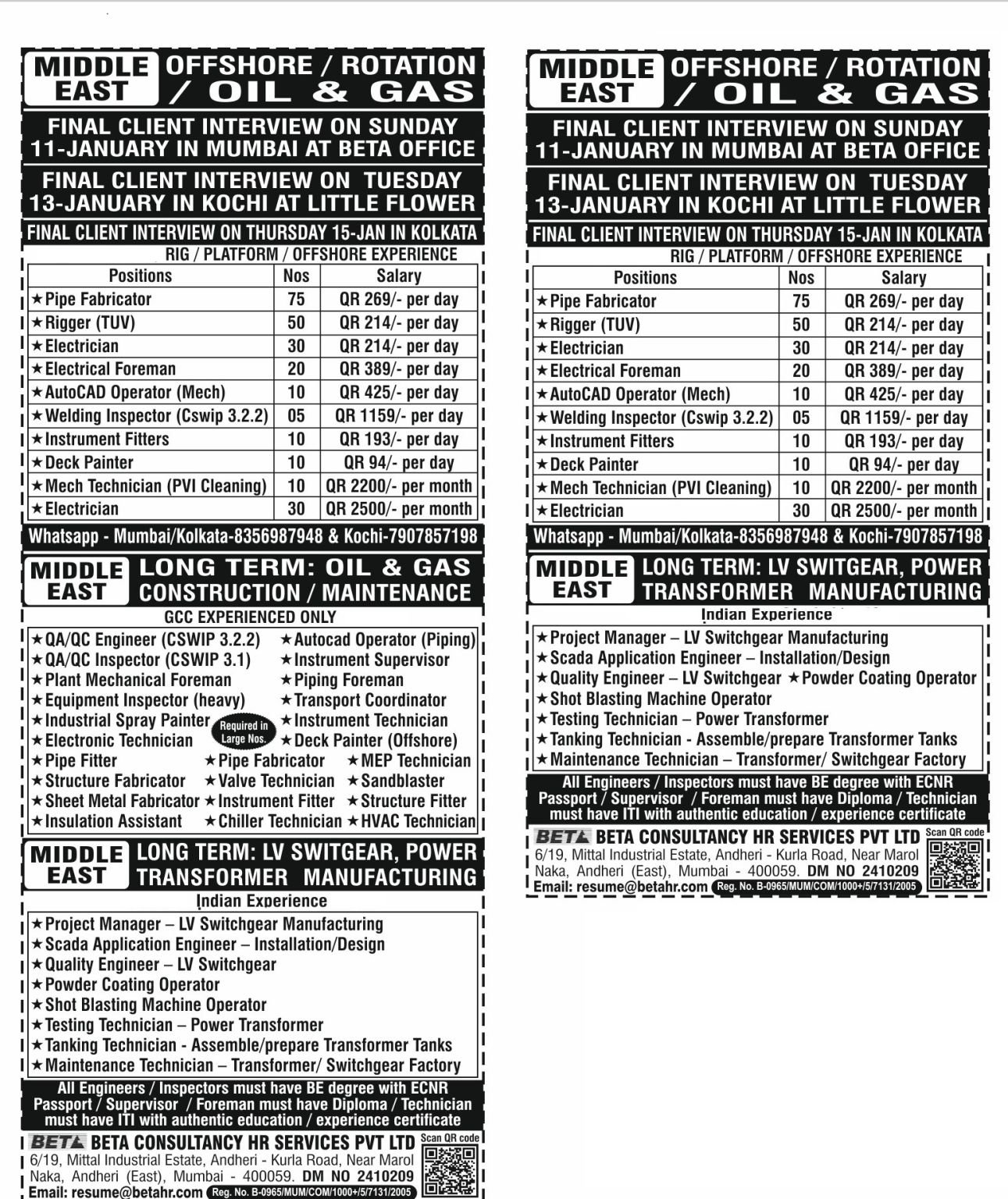 Walk-in to our MUMBAI office for shortlisting and scheduling interview OR send biodata and document copies to Email: resume@betahr.com