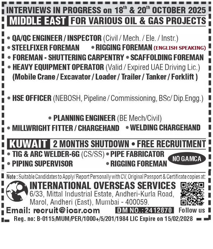 Interview for shutdown project at Gurdaspur on 27-10-2025, at Kochi on 1-11-2025 & at Mumbai on 9-11-2025.