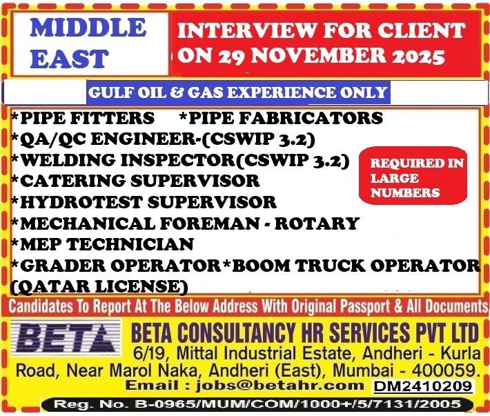 Walk-in to our MUMBAI office for shortlisting and scheduling interview OR send biodata and document copies to Email: resume@betahr.com