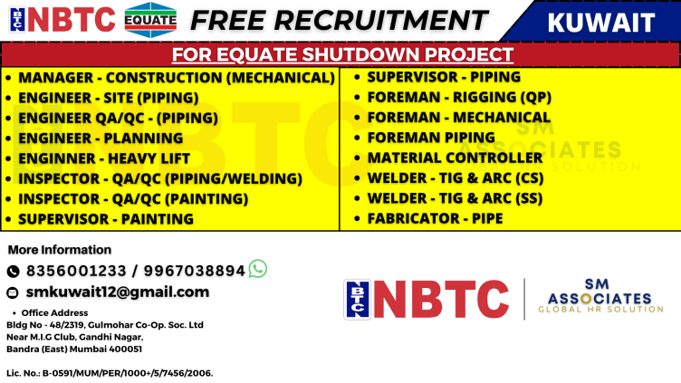 Urgent Free Recruitment for EQUATE Shutdown Project in Kuwait! NBTC in association with SM Associates invites applications for multiple technical roles in one of the largest petrochemical shutdown projects. No placement fees – Direct client hiring.
