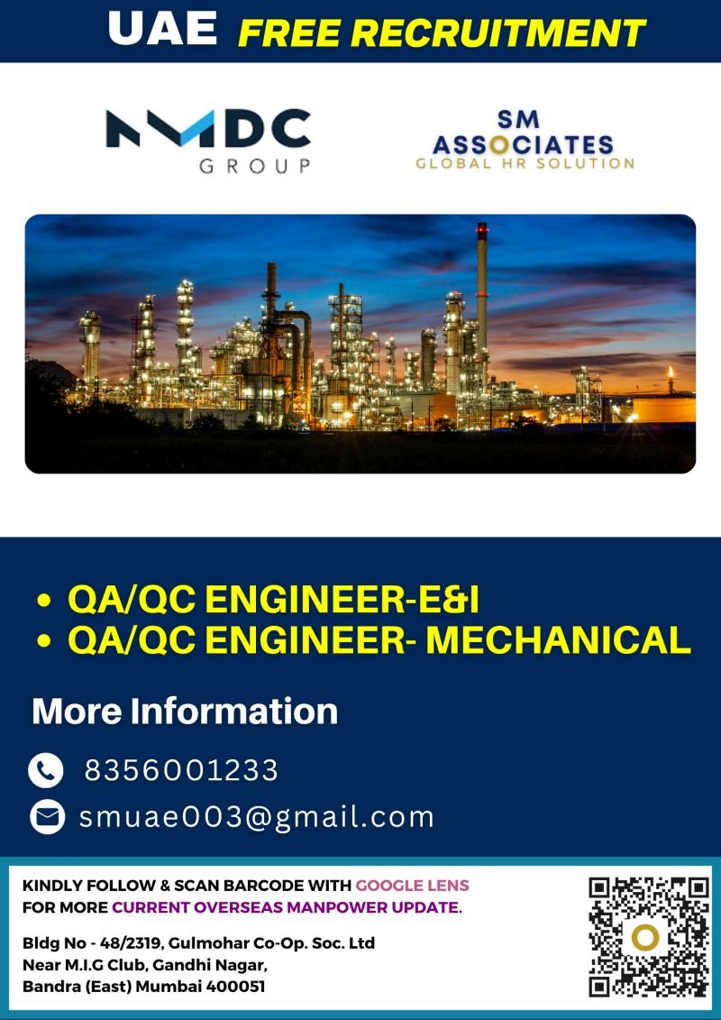 NMDC Group, in association with SM Associates Global HR Solution, is offering free recruitment for UAE-based roles. Apply now for QA/QC Engineer – E&I and QA/QC Engineer – Mechanical positions with immediate opportunities!