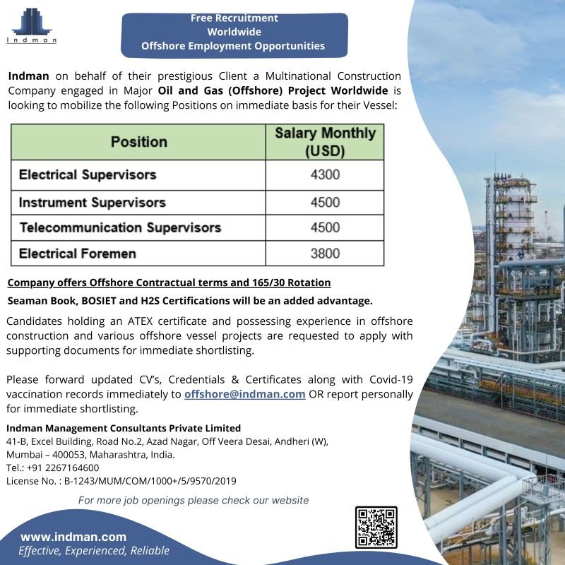 Indman on behalf of their prestigious Client a Multinational Construction Company engaged in Major Oil and Gas (Offshore) Project Worldwide looking to mobilize the following Positions on immediate basis:
