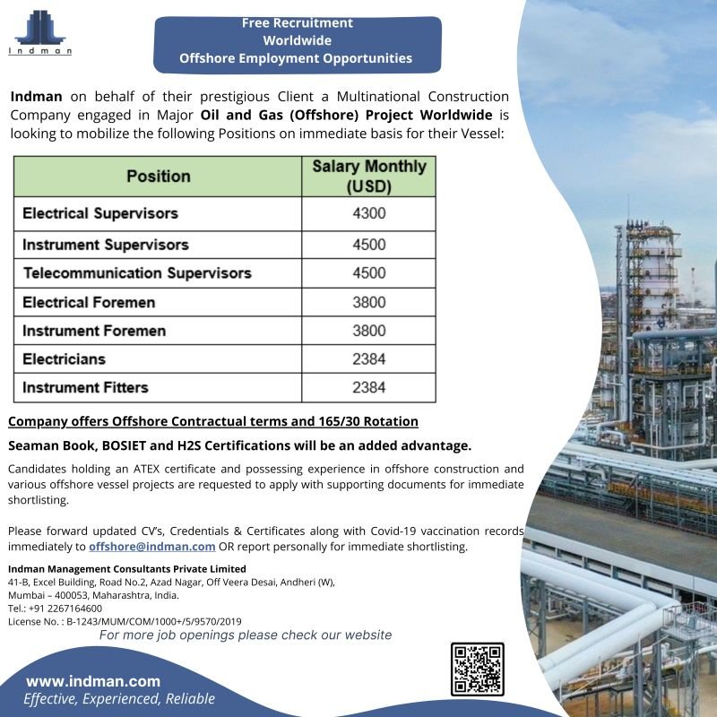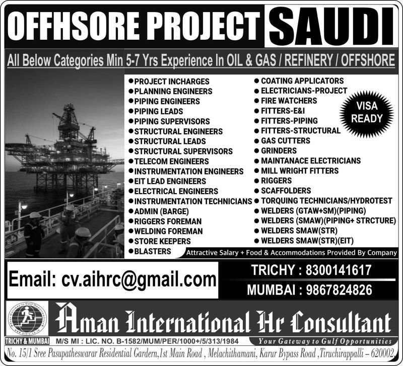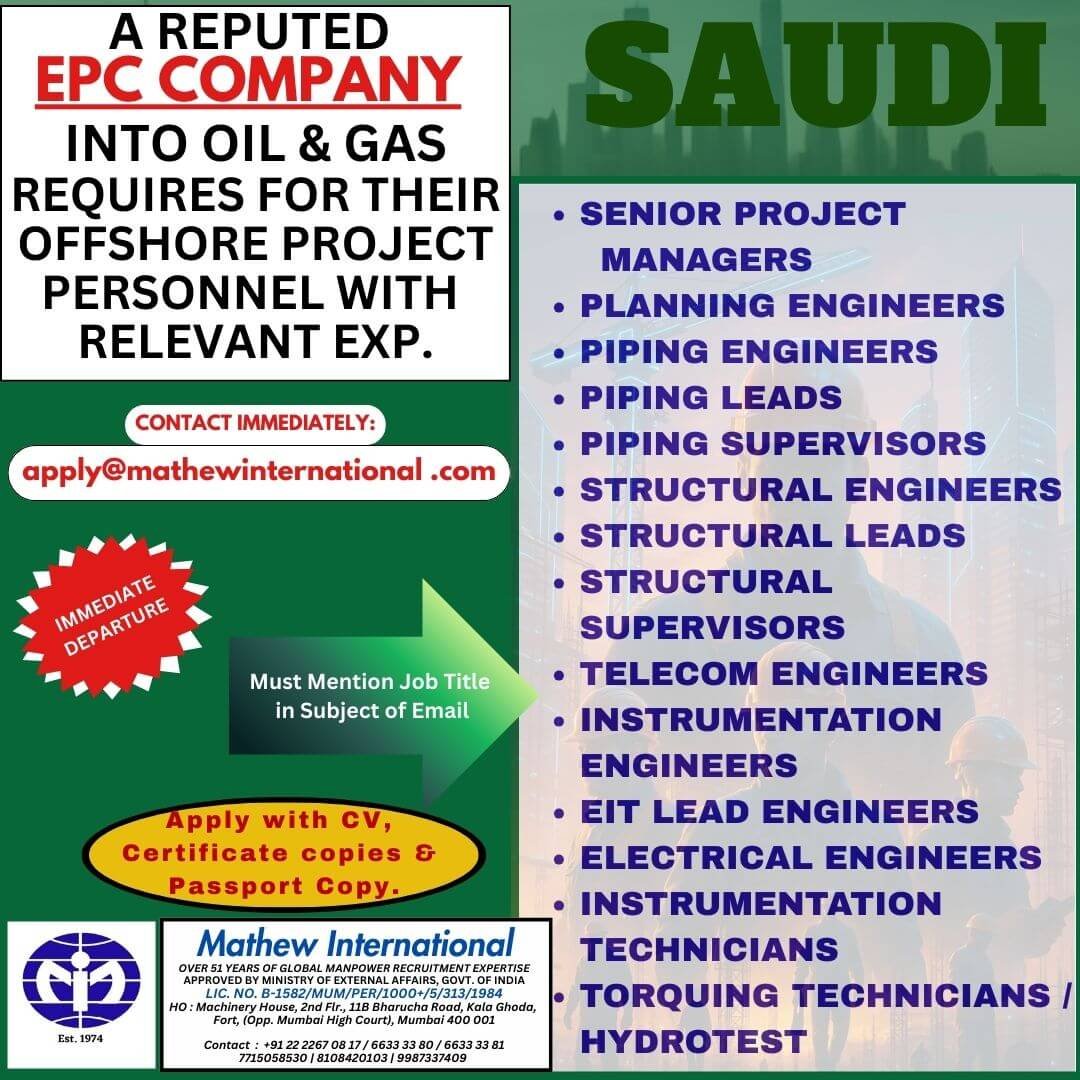 Jobs in Saudi Arabia – Offshore Oil & Gas Project by Reputed EPC Company