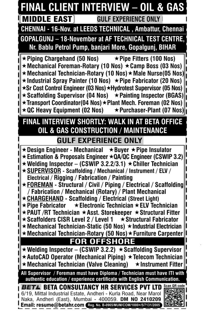 Walk-in to our MUMBAI office for shortlisting and scheduling interview OR send biodata and document copies to Email: resume@betahr.com