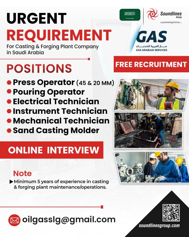 Recruitment For Casting & Forging Plant Company in Saudi Arabia