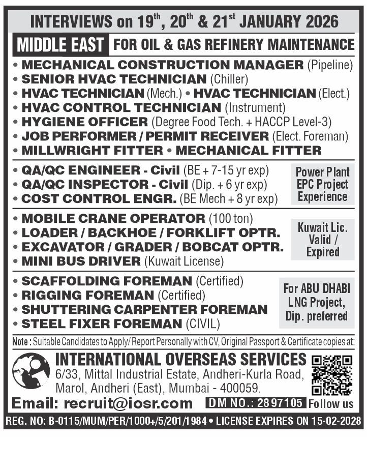 Abu Dhabi (UAE) Oil & Gas Construction Project – Urgent Walk-in Interviews on 19th & 20th January 2026