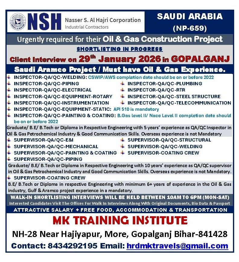 Urgent Job Vacancies in Saudi Arabia – Aramco Project 2026 (Client Interview 18th–22nd Jan)