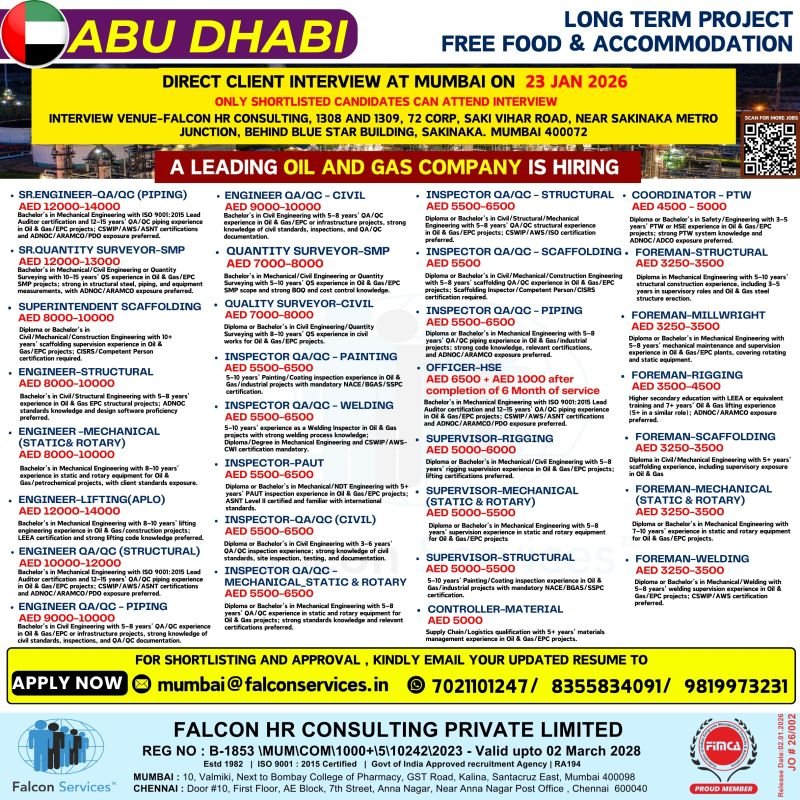 Urgent Abu Dhabi Oil & Gas Jobs 2026 | Long-Term Project with Leading Company – Direct Client Interview on 23rd January