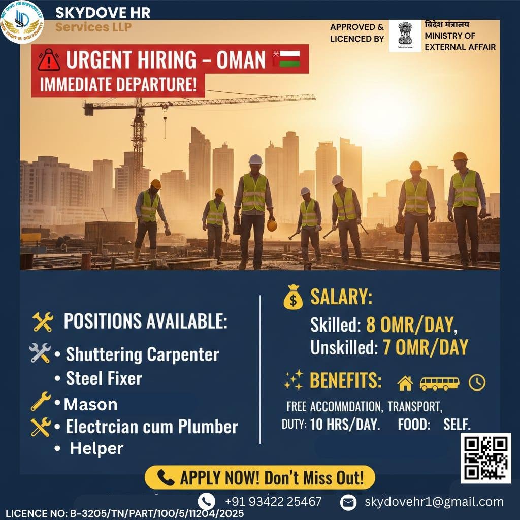 Urgent hiring for Oman construction projects! Skilled & unskilled workers needed with immediate departure. 8 OMR/day skilled, 7 OMR/day unskilled + free accommodation & transport. Ministry approved recruiter!