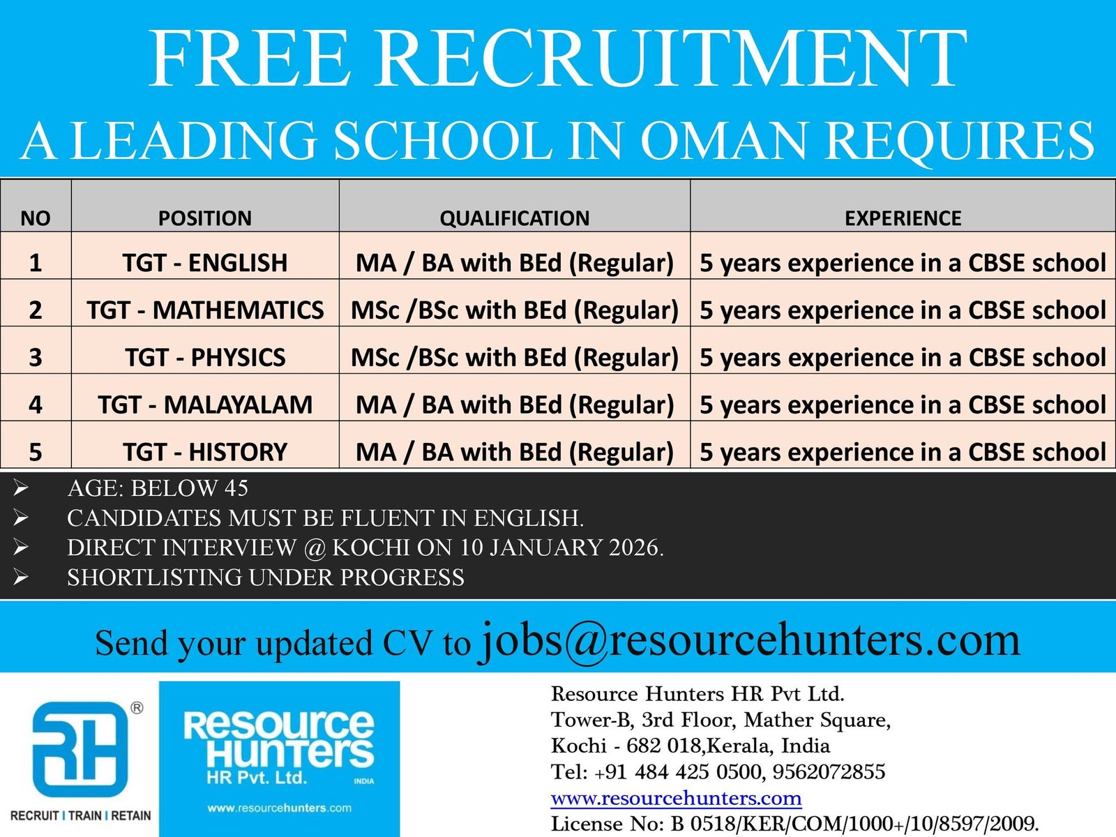 Email Your CV To jobs@resourcehunters.com (Mention position in subject, e.g., “TGT English – Oman”)