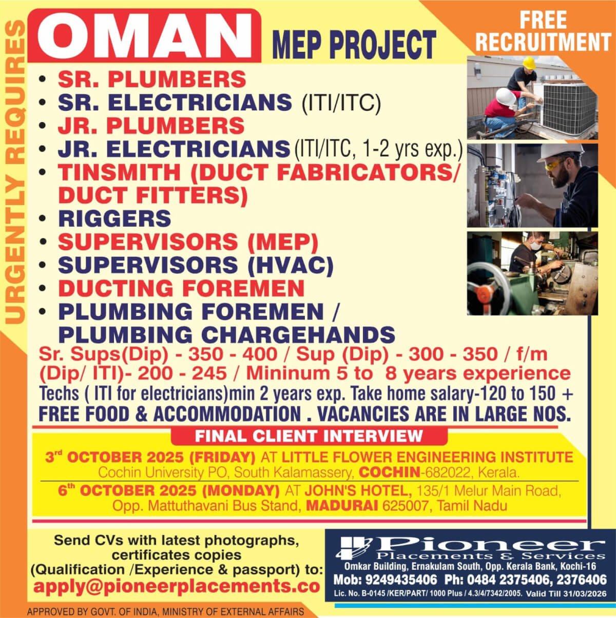Are you looking for exciting job opportunities in Oman? The Oman MEP Project is urgently recruiting skilled professionals for various roles. This is your chance to join a prestigious project with free food & accommodation and competitive salaries. Read on to learn more about the vacancies and how to apply.