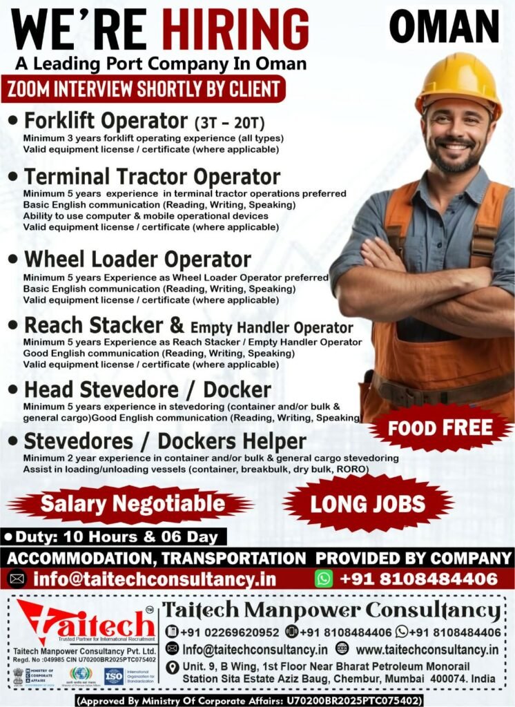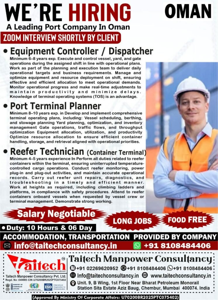 Taitech Manpower Consultancy has announced urgent hiring for a leading port company in Oman. The recruitment will be conducted through a Zoom interview shortly by the client. This is a great opportunity for experienced professionals in port and container terminal operations looking for long-term jobs in Oman with free food, accommodation, and transportation.