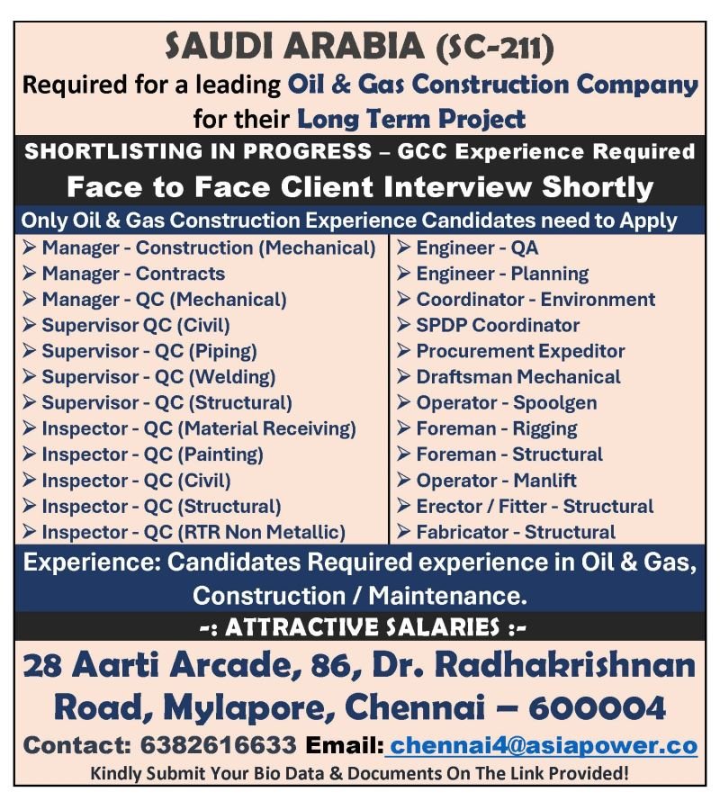 Saudi Arabia – Long Term Jobs – Oil & Gas Construction Company