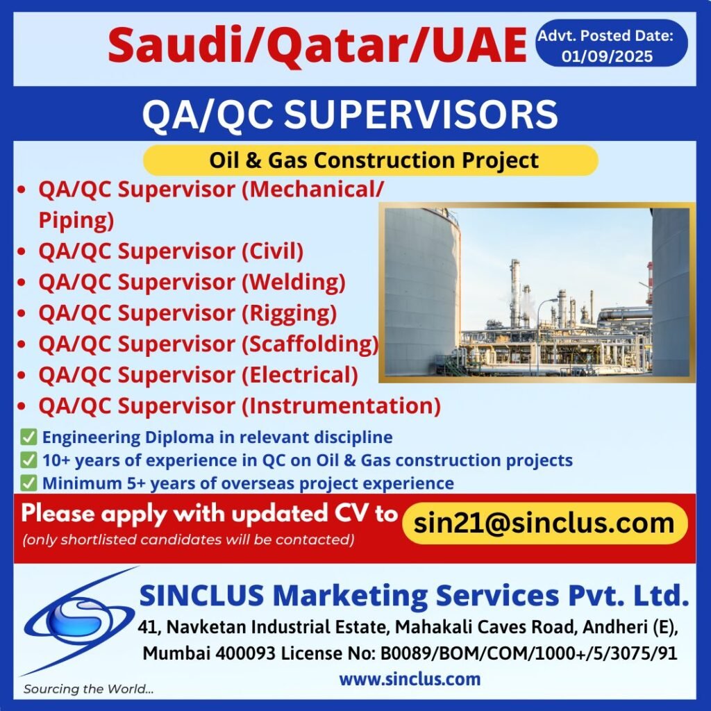 Are you a skilled QA/QC engineer looking for opportunities in the oil and gas sector? Sinclus Marketing Services Pvt. Ltd. is hiring for multiple positions across Saudi Arabia, Qatar, and the UAE. Posted on 01/09/2025, this is a prime chance to join exciting construction projects!