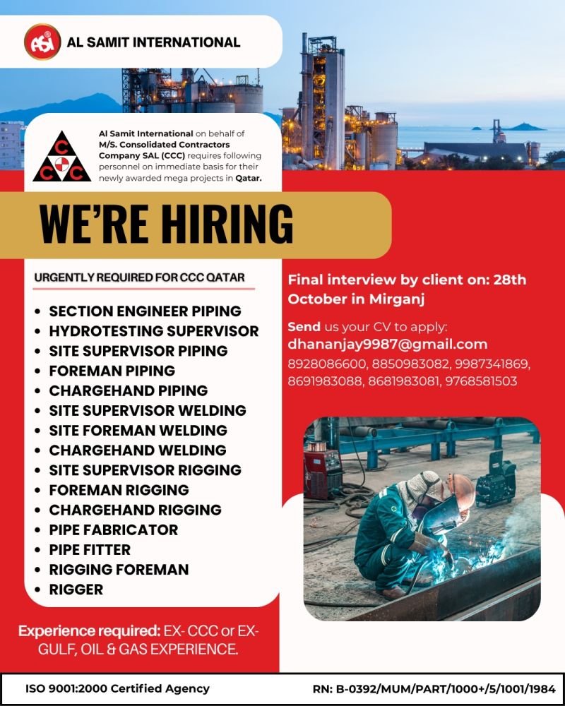 Al Samit International urgently recruits Ex-CCC / Ex-Gulf Oil & Gas experienced professionals for Consolidated Contractors Company (CCC) Qatar mega projects. Final client interview: 28th October 2025 in Mirganj.