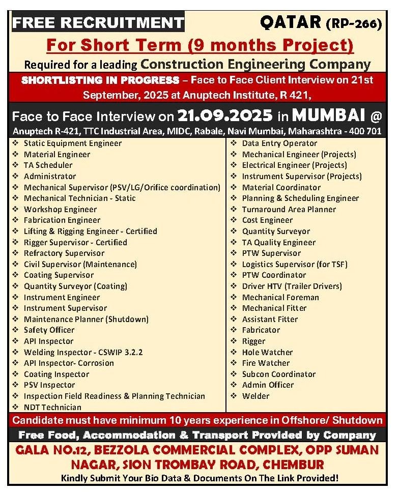 Qatar : Free Recruitment For Engineering Company ( 9 Months Project )