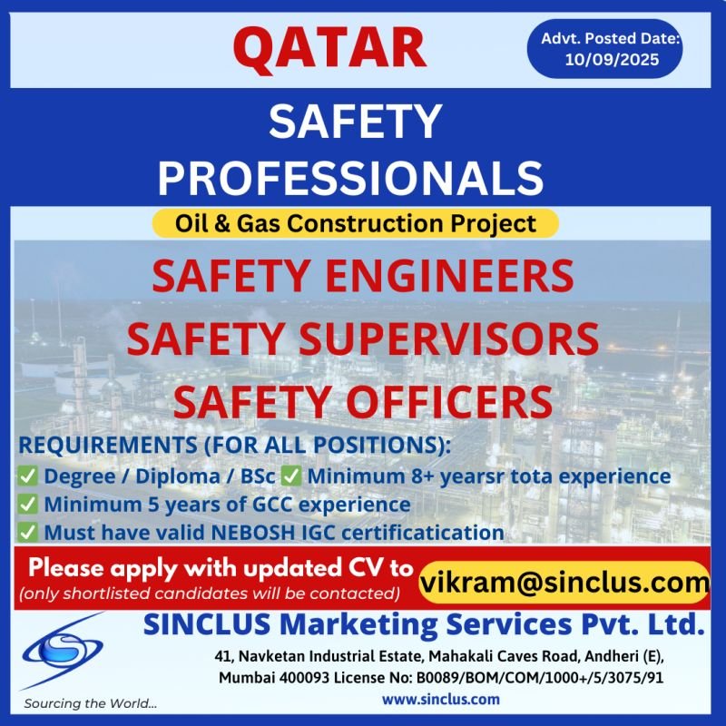 Sinclus is looking for experienced SAFETY PROFESSIONALS for one of its clients, a leading company in the Oil & Gas construction sector.